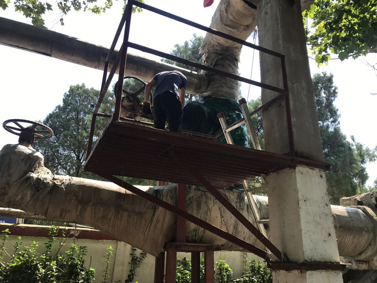 在鐵塔寺小區(qū)檢修現(xiàn)場(chǎng),幾名檢修人員正頂著近36度的高溫對(duì)二次網(wǎng)管道的保溫進(jìn)行修補(bǔ)、更換。雖然天氣悶熱,但為了保證冬季供暖效果、減少不必要的損耗、確保設(shè)備狀態(tài)良好,他們加班加點(diǎn),趕著在天黑之前完成此項(xiàng)檢修工作。