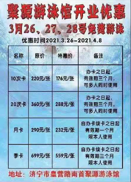 聚源游泳館將于2021年3月26日迎春開館,為答謝新老客戶,聚源游泳館開業(yè)之際3月26-4月8日所售游泳卡一律八折優(yōu)惠。開業(yè)前三天3月26日-28日免費游泳啦!敬請廣大朋友相互告知,共赴盛舉。